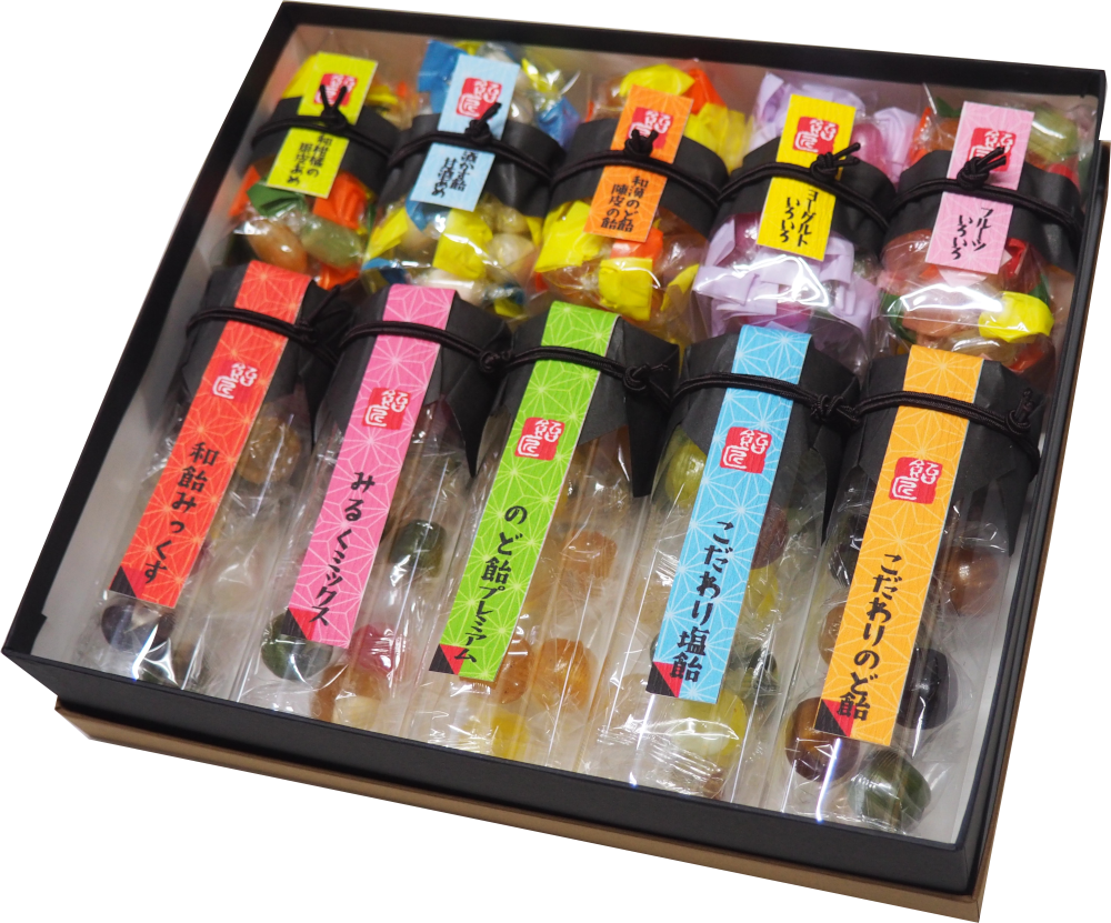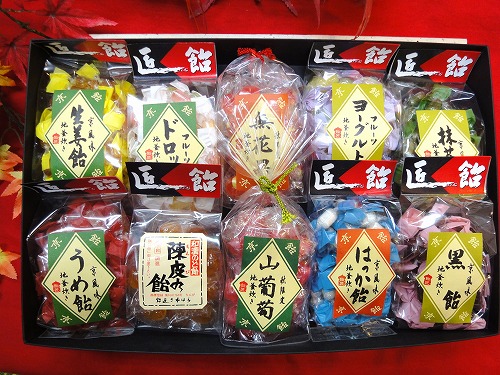 和漢のど飴(陳皮の飴)、京風味(黒飴、抹茶飴、はっか飴、生姜飴、梅飴、フルーツドロップ、フルーツヨーグルト)、無花果飴、山葡萄飴、 10種類袋入りの進物セット!
