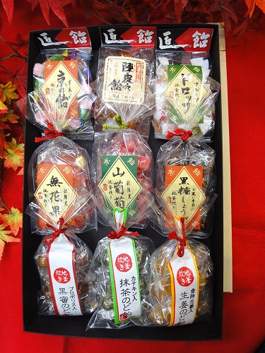 和漢のど飴(陳皮の飴)、京風味京の飴、京風味フルーツドロップ、黒糖しょうが飴、無花果飴、山葡萄飴、金時生姜のど飴、カテキン抹茶のど飴、プロポリス黒蜜のど飴 9種類袋入りの進物セット!